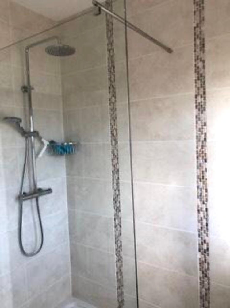 The bathroom has a large walk-in shower and toilet